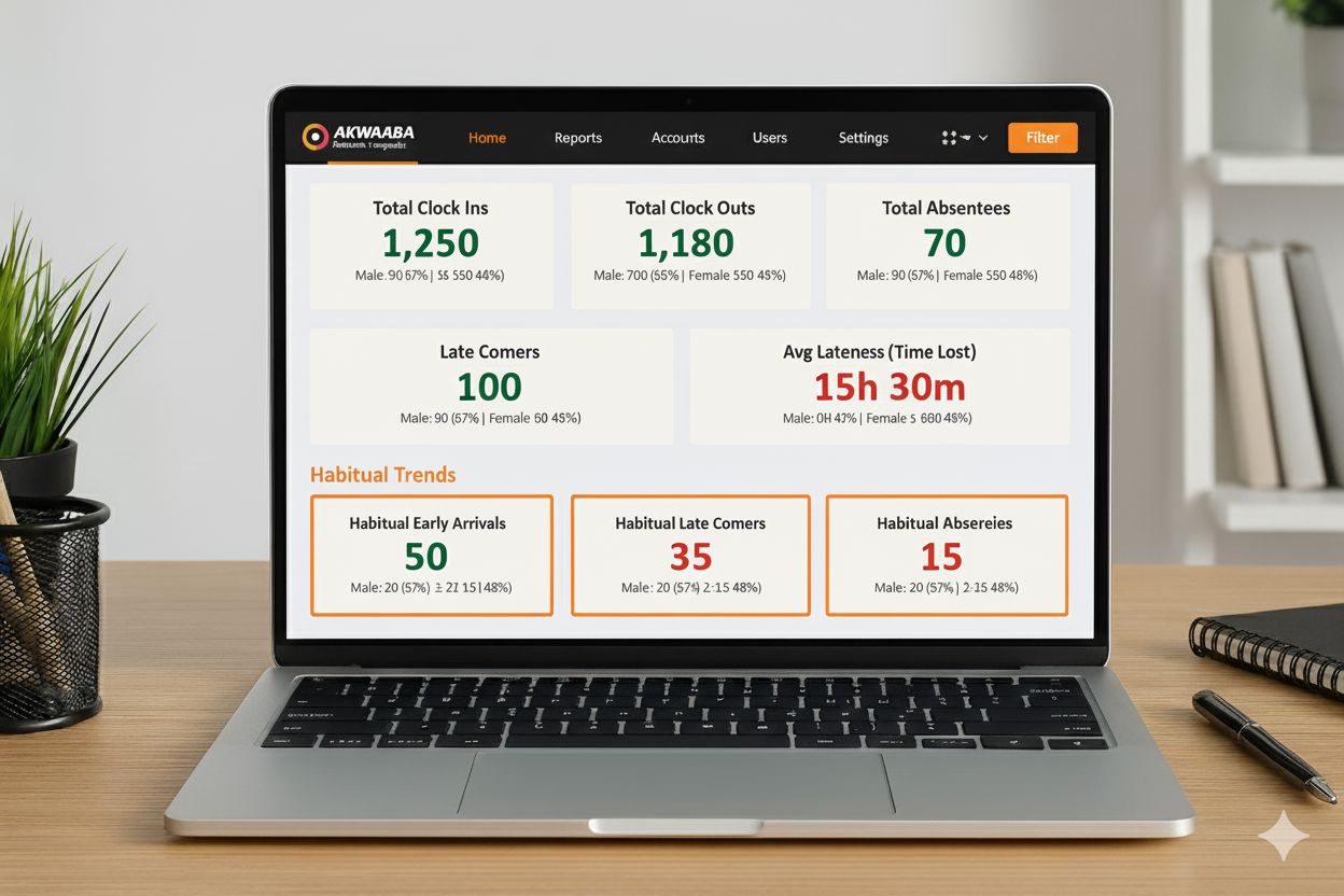 The Akwaaba Smart Attendance System separates these automatically — saving hours of manual counting and giving you real-time attendance insights.
